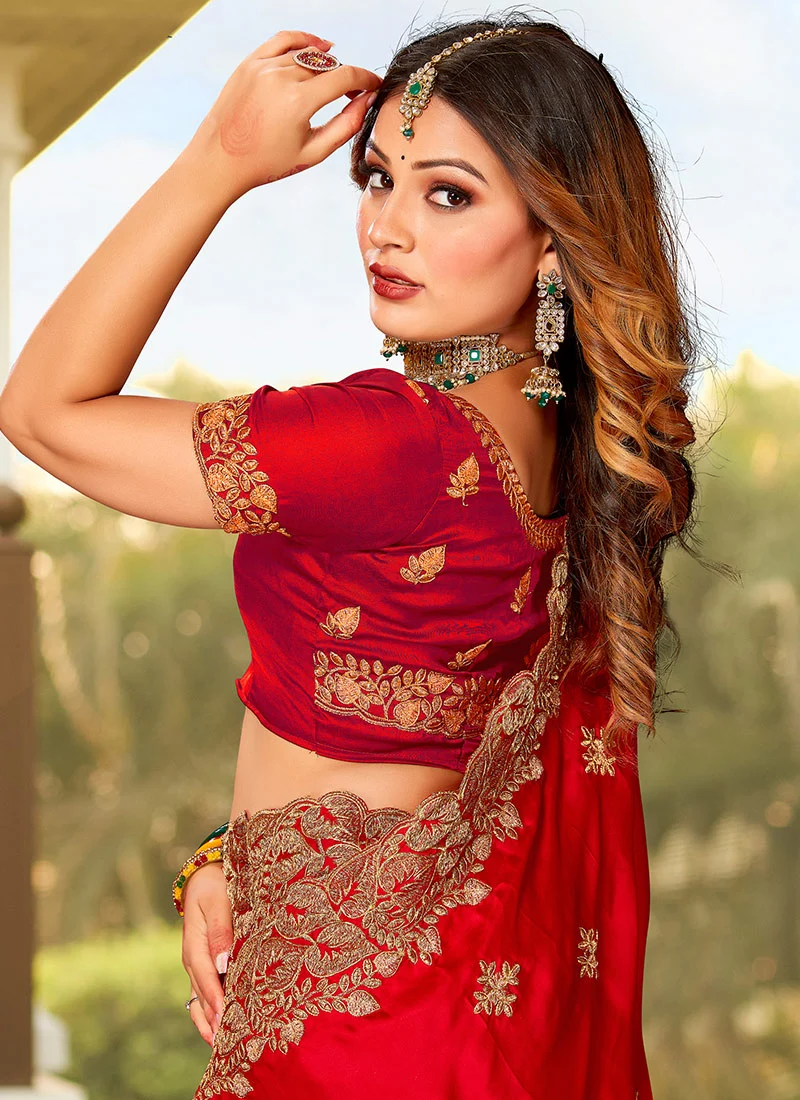 Red Satin Blend Embroidered Saree Party Wear
