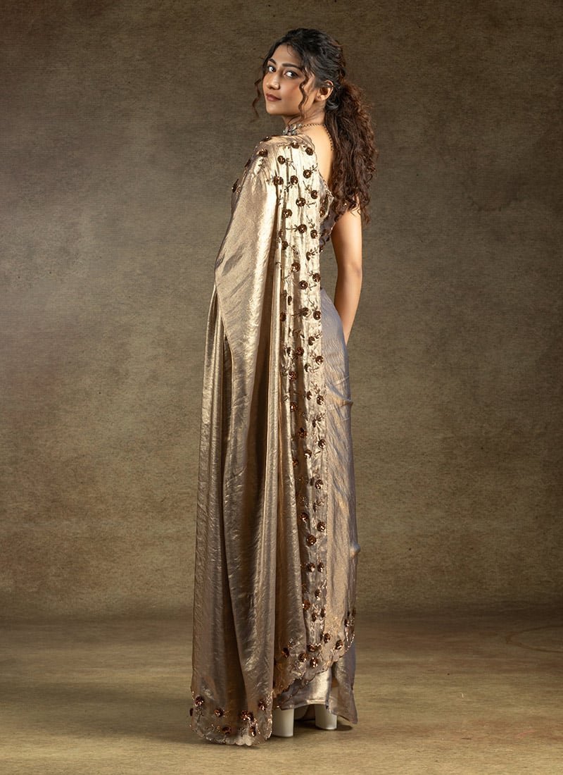 Grey Satin Silk Hand Embroidered Sequins With Applique And Stone Work Saree Wedding Wear