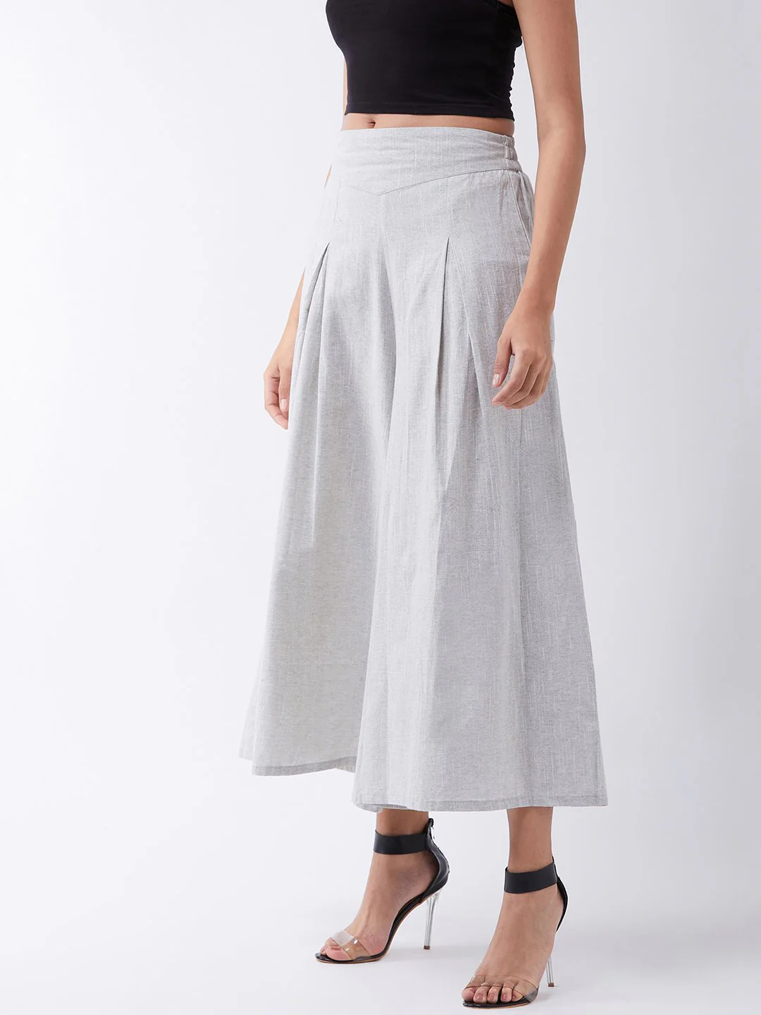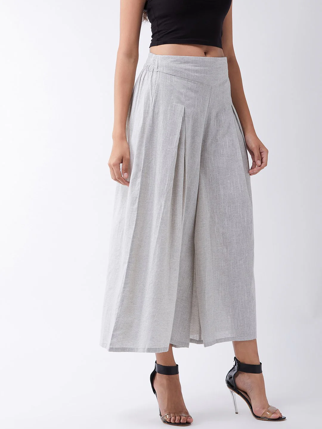 Embrace the spirit of summer with this pair of cool, gray-colored handloom palazzos. These cropped palazzos are made with original cotton fabric and showcase pretty front pleats.