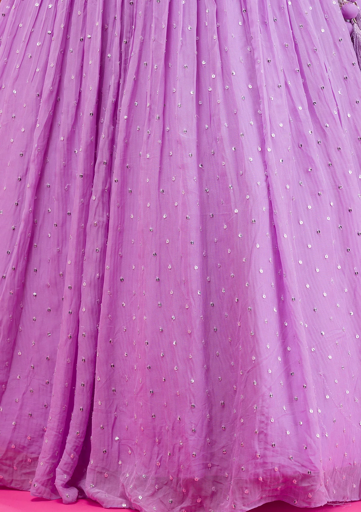 Twirl with joy in Lavender Lehenga, where the elegance of georgette meets the timeless charm of pearlwork embroidery. Each fold of this stunning skirt sparkles with playful pearls, complemented by a gracefully designed top that flaunts vibrant patterns and intricate details, ideal for making your every moment celebratory. Experience the blend of traditional craftsmanship and contemporary style with this mesmerizing attire that is as spirited and lively as you are!.